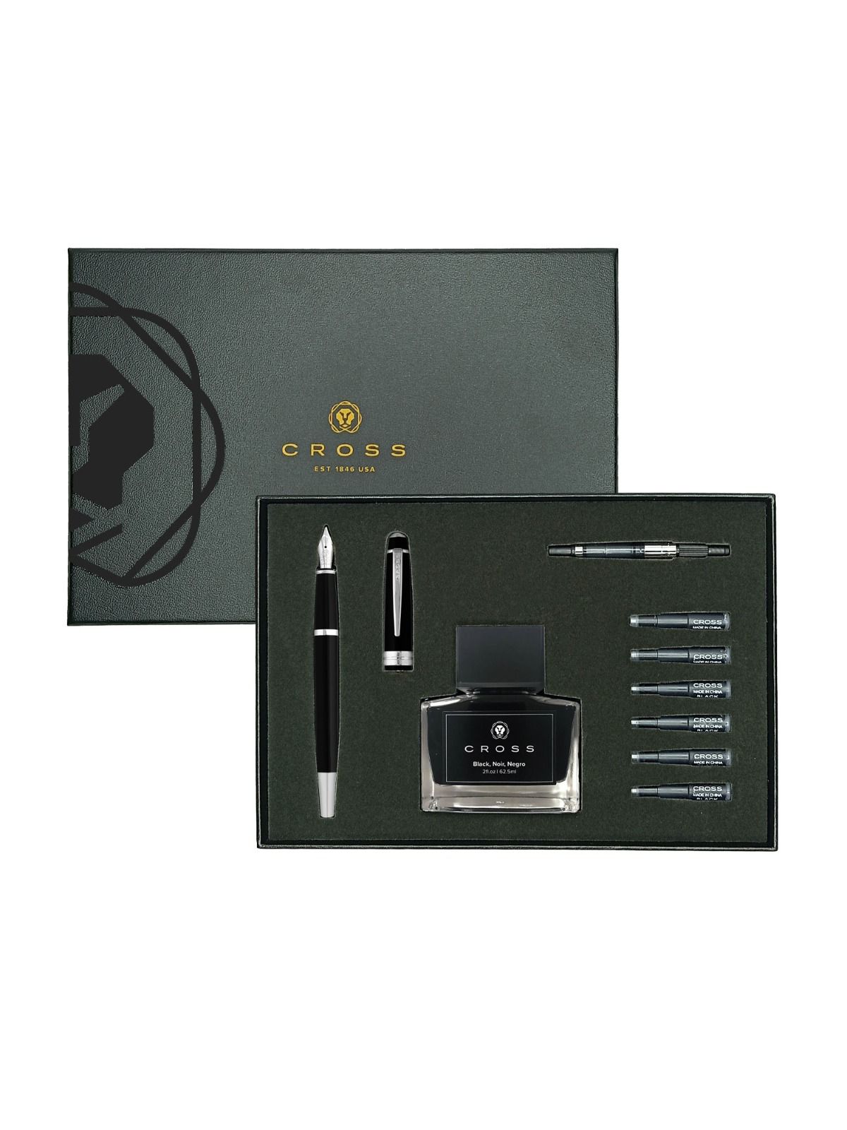 Cross Bailey Black Lacquer Fountain Pen Gift Set – This kit includes a black lacquer fountain pen with a click-off cap, six black ink cartridges, as well as a bottled-ink converter and a bottle of black Cross ink.