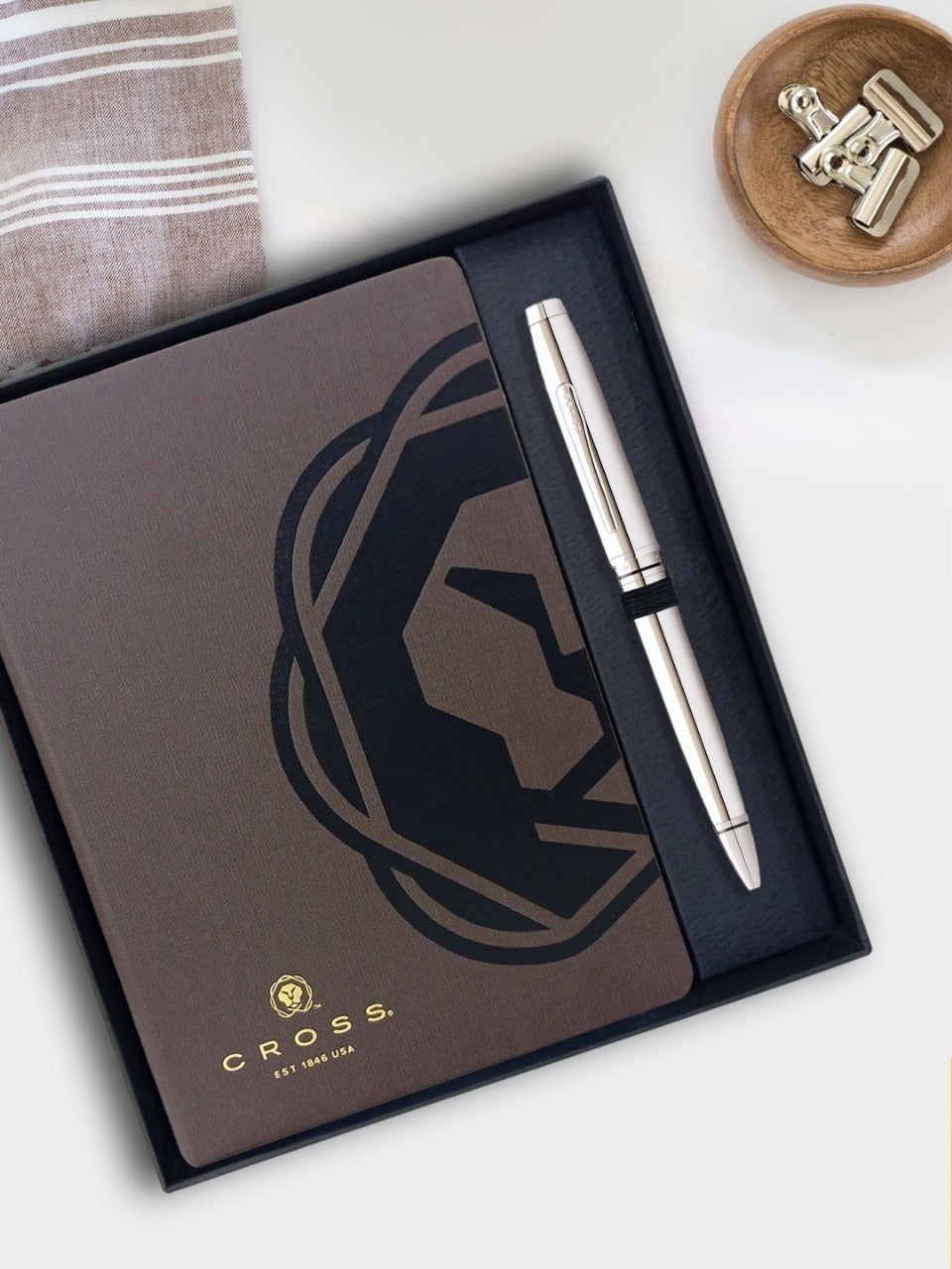 Cross Coventry Polished Chrome Ballpoint Pen with Brown Notebook