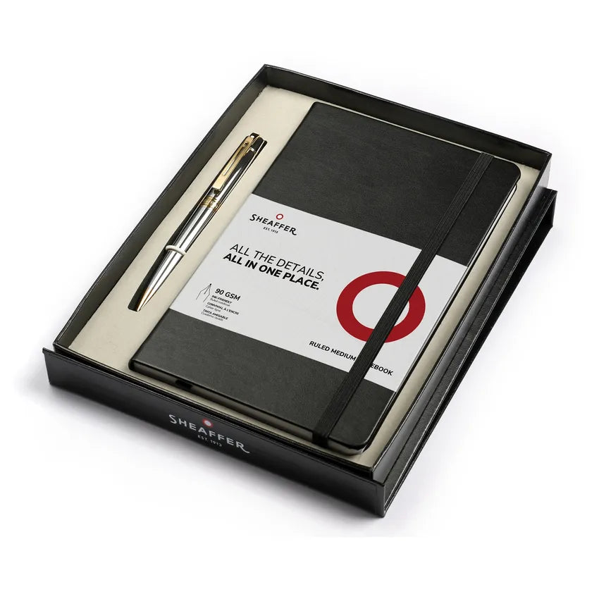 Sheaffer Gift Set 300 9342 Ballpoint Pen with Medium Notebook Bright Chrome with Gold Trims